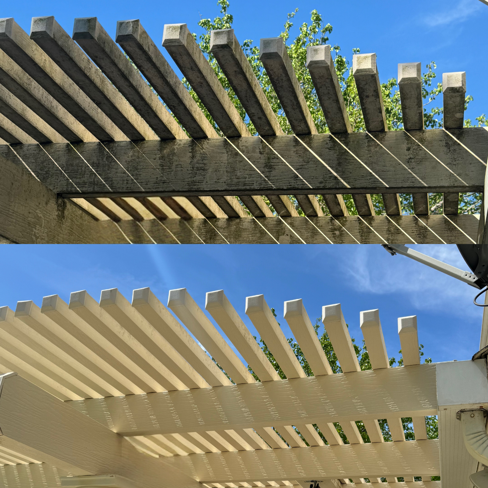 First, we removed all furniture and protected nearby electrical fixtures. Then, we worked from the ceiling downward using soft-wash techniques on painted surfaces to eliminate spider webs and staining without damaging the finish. Next, we treated the wood columns carefully to remove water streaks while preserving the paint.