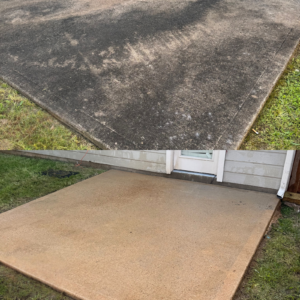Initially, the homeowners rinsed the surface periodically. However, standard hose washing could not remove the embedded organic film bonded to the concrete. In Sugar Land’s humid climate, irrigation and shade frequently accelerate surface staining on residential flatwork.