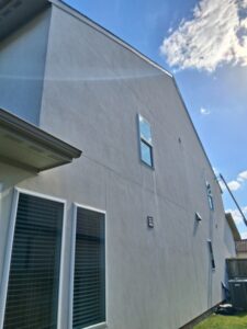 That shade — combined with Missouri City’s year-round humidity and the home’s sprinkler system — had created ideal conditions for organic growth to establish and spread unchecked. What had started as faint green discoloration along the upper panels of the shaded elevations had grown over two seasons into full coverage algae that had crept to the front elevation and become clearly visible from the street.