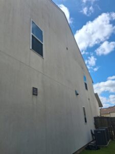 This Missouri City property required professional House Washing Missouri City TX services after green algae and black mildew streaking had spread extensively across the home’s exterior vinyl siding. The two-story home sat on a corner lot in an established Missouri City neighborhood, surrounded by mature trees on two sides that kept the north and west elevations in near-constant shade throughout the day.